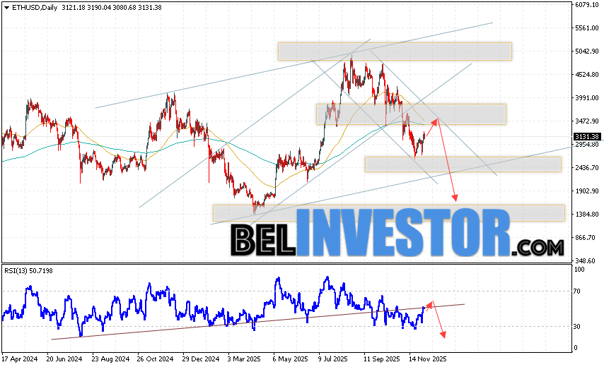 Дополнительным сигналом в пользу падения котировок ETH/USD на текущей торговой неделе 8 — 12 декабря 2025 выступит тест линии сопротивления на индикаторе относительной силы. Вторым сигналом станет отскок от верхней границы медвежьей канала. Отменой варианта падения стоимости криптовалюты на текущей торговой неделе станет сильный рост и пробой уровня 3985. Это укажет на пробой области сопротивления и продолжение роста котировок ETH/USD с потенциальной целью выше уровня 4545. Подтверждением падению криптовалюты Ethereum выступит пробой области поддержки и закрытие котировок ниже уровня 2375.