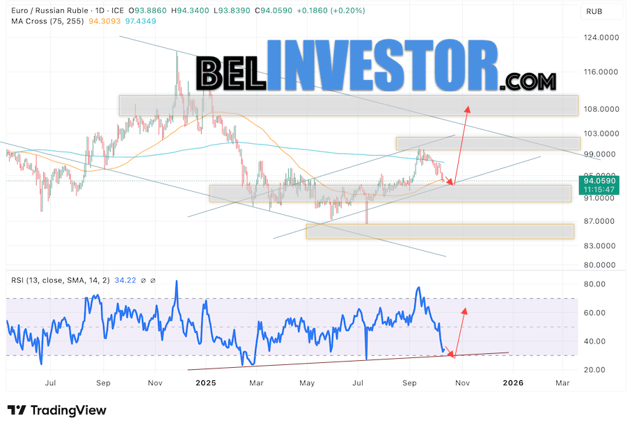 Дополнительным сигналом в пользу подъёма валютной пары EUR/RUB на текущей торговой неделе выступит отбой от нижней границы восходящего канала. Вторым сигналом станет отскок от линии поддержки на индикаторе относительной силы (RSI). Отменой варианта роста пары EUR/RUB на текущей торговой неделе 13 — 17 октября 2025 станет падение и пробой уровня 92.25 Евро за Рубль. Это укажет на пробой области поддержки и продолжение падения пары Евро Рубль в область ниже уровня 90.15. Подтверждением росту пары на текущей торговой неделе выступит пробой области сопротивления и закрытие котировок выше отметки 99.05.