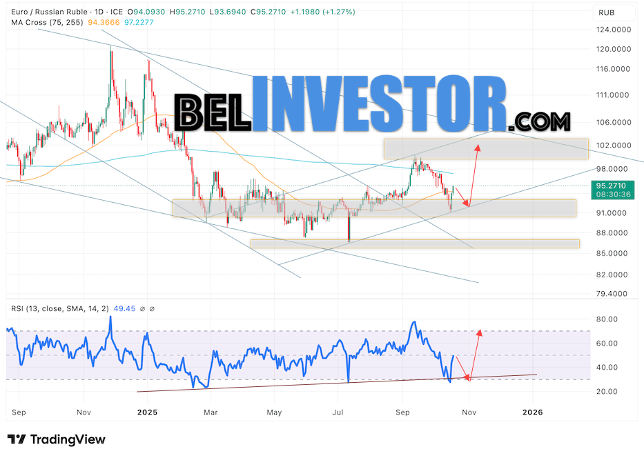 Дополнительным сигналом в пользу подъёма валютной пары EUR/RUB на текущей торговой неделе выступит отбой от нижней границы восходящего канала. Вторым сигналом станет отскок от линии поддержки на индикаторе относительной силы (RSI). Отменой варианта роста пары EUR/RUB на текущей торговой неделе 20 — 24 октября 2025 станет падение и пробой уровня 90.45 Евро за Рубль. Это укажет на пробой области поддержки и продолжение падения пары Евро Рубль в область ниже уровня 87.45. Подтверждением росту пары на текущей торговой неделе выступит пробой области сопротивления и закрытие котировок выше отметки 96.45.
