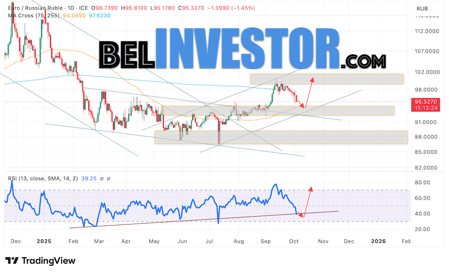 Дополнительным сигналом в пользу подъёма валютной пары EUR/RUB на текущей торговой неделе выступит отбой от нижней границы восходящего канала. Вторым сигналом станет отскок от линии поддержки на индикаторе относительной силы (RSI). Отменой варианта роста пары EUR/RUB на текущей торговой неделе 6 — 10 октября 2025 станет падение и пробой уровня 93.45 Евро за Рубль. Это укажет на пробой области поддержки и продолжение падения пары Евро Рубль в область ниже уровня 90.65. Подтверждением росту пары на текущей торговой неделе выступит пробой области сопротивления и закрытие котировок выше отметки 96.55.