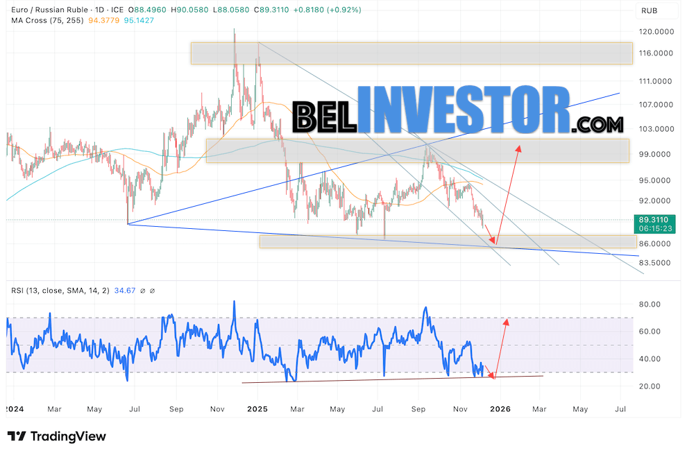 Дополнительным сигналом в пользу подъёма валютной пары EUR/RUB на текущей торговой неделе выступит отбой от нижней границы восходящего канала. Вторым сигналом станет отскок от линии поддержки на индикаторе относительной силы (RSI). Отменой варианта роста пары EUR/RUB на текущей торговой неделе 8 — 12 декабря 2025 станет падение и пробой уровня 83.25 Евро за Рубль. Это укажет на пробой области поддержки и продолжение падения пары Евро Рубль в область ниже уровня 79.05. Подтверждением росту пары на текущей торговой неделе выступит пробой области сопротивления и закрытие котировок выше отметки 92.65.