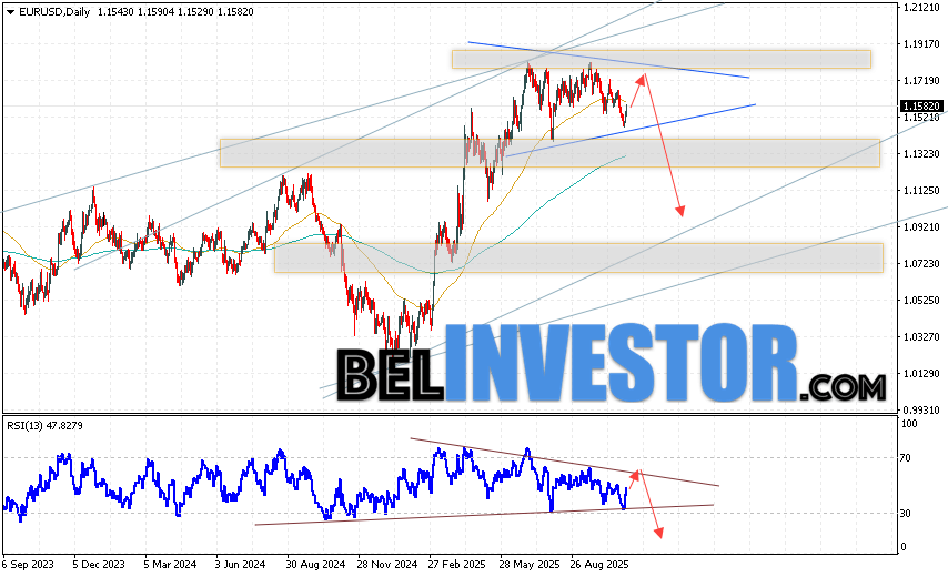 Дополнительным сигналом в пользу снижения пары EUR/USD на Форекс выступит тест нисходящей лини сопротивления на индикаторе относительной силы (индикатор RSI). Вторым сигналом станет отскок от верхней границы модели «Треугольник». Отменой варианта снижения котировок пары Евро Доллар на текущей торговой неделе 10 — 14 ноября 2025, станет сильный рост и пробой уровня 1.2065. Это укажет на пробой области сопротивления и продолжение роста пары в область выше уровня 1.2345. С пробоем области поддержки и закрытием котировок ниже уровня 1.1345 стоит ожидать подтверждение падению котировок пары, что укажет на пробой нижней границы модели «Треугольник» и начало реализации паттерна с целями внизу.