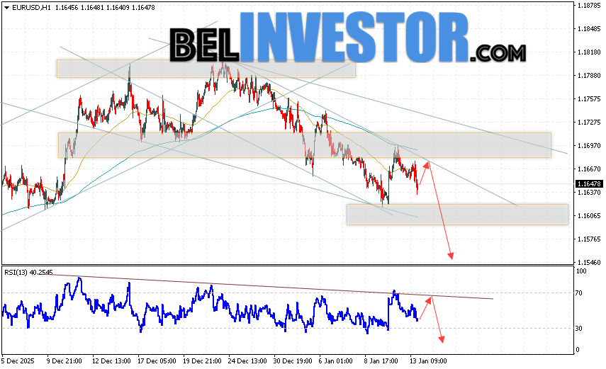 EUR/USD прогноз Евро Доллар на 14 января 2026 предполагает попытку подъёма котировок валюты с тестом уровня сопротивления вблизи уровня 1.1685. Откуда стоит ожидать отскок котировок вниз валютной пары Евро Доллар и попытку продолжения падения инструмента на рынке Форекс с целью на уровне 1.1545. Дополнительным сигналом выступит отбой от линии сопротивления на индикаторе относительной силы (RSI). Отменой варианта падения пары EUR/USD станет сильный рост котировок и пробой уровня 1.1725. Это укажет на пробой зоны сопротивления и продолжение роста валютной пары на Форекс к отметке 1.1985.