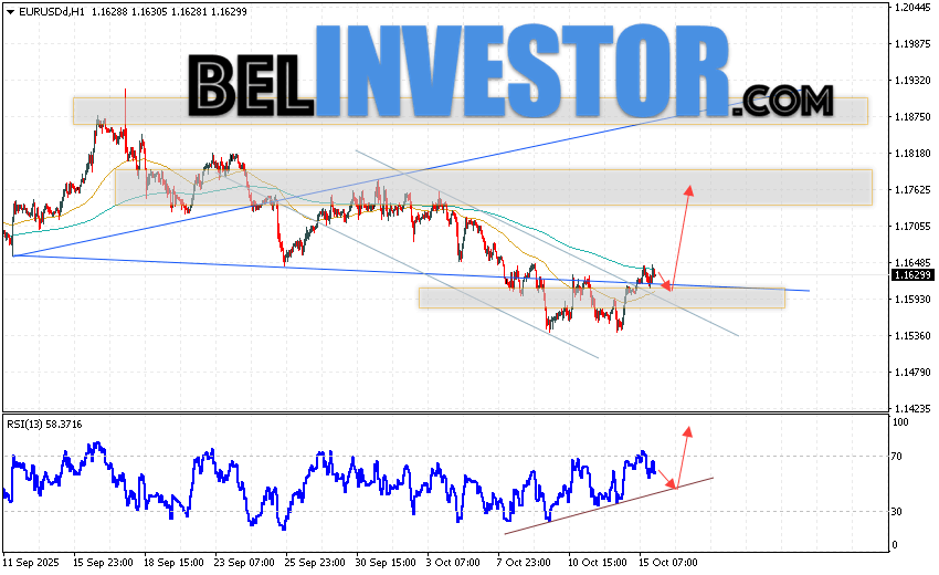 EUR/USD прогноз Евро Доллар на 16 октября 2025 предполагает попытку развития медвежьей коррекции котировок валюты с тестом уровня поддержки вблизи уровня 1.1605. Откуда стоит ожидать отскок котировок вверх валютной пары Евро Доллар и попытку продолжения роста стоимости актива на рынке до отметки 1.1765. Вспомогательным сигналом в пользу подъёма инструмента на рынке Форекс выступит отбой от линии поддержки на индикаторе относительной силы (RSI). Отменой варианта роста пары EUR/USD станет падение котировок и пробой уровня 1.1515. Это укажет на пробой зоны поддержки и продолжение падения валютной пары на Форекс к отметке 1.1375.