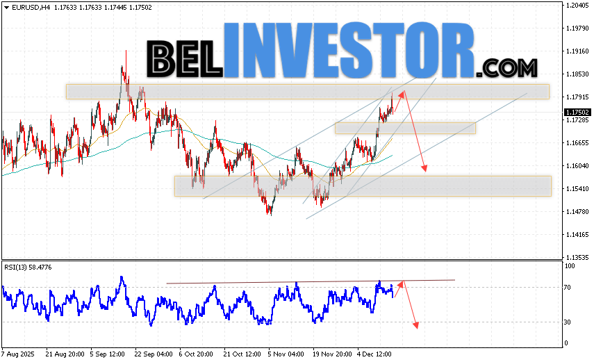 EUR/USD прогноз Евро Доллар на 17 декабря 2025 предполагает попытку развития бычьей коррекции котировок валюты с тестом уровня сопротивления вблизи уровня 1.1815. Откуда стоит ожидать отскок котировок вниз валютной пары Евро Доллар и попытку продолжения падения стоимости актива на рынке до отметки 1.1595. Вспомогательным сигналом в пользу снижения инструмента на рынке Форекс выступит отбой от линии сопротивления на индикаторе относительной силы (RSI). Отменой варианта падения пары EUR/USD станет сильный рост котировок и пробой уровня 1.1885. Это укажет на пробой зоны сопротивления и продолжение роста валютной пары на Форекс к отметке 1.2045.