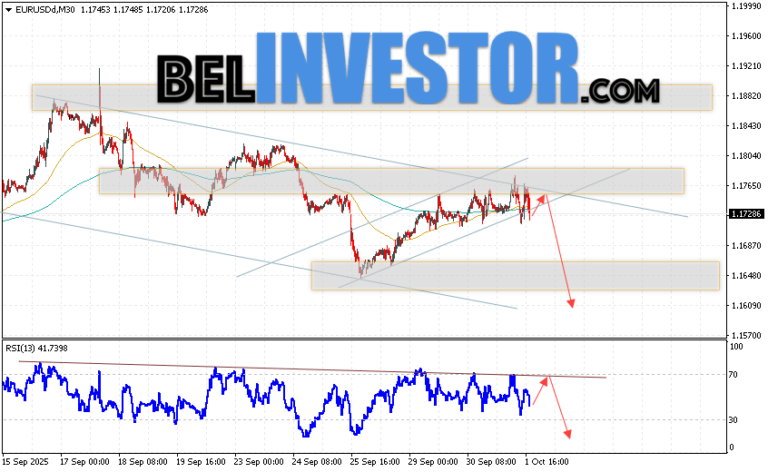 EUR/USD прогноз Евро Доллар на 2 октября 2025 предполагает попытку развития бычьей коррекции котировок валюты с тестом уровня сопротивления вблизи уровня 1.1745. Откуда стоит ожидать отскок котировок вниз валютной пары Евро Доллар и попытку продолжения падения стоимости актива на рынке до отметки 1.1615. Вспомогательным сигналом в пользу снижения инструмента на рынке Форекс выступит отбой от линии сопротивления на индикаторе относительной силы (RSI). Отменой варианта падения пары EUR/USD станет сильный рост котировок и пробой уровня 1.1795. Это укажет на пробой зоны сопротивления и продолжение подъёма валютной пары на Форекс к отметке 1.1975.