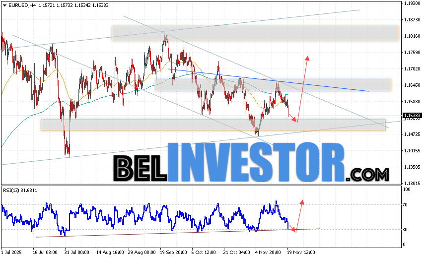 EUR/USD прогноз Евро Доллар на 20 ноября 2025 предполагает попытку развития медвежьей коррекции котировок валюты с тестом уровня поддержки вблизи уровня 1.1525. Откуда стоит ожидать отскок котировок вверх валютной пары Евро Доллар и попытку продолжения роста стоимости актива на рынке до отметки 1.1525. Вспомогательным сигналом в пользу подъёма инструмента на рынке Форекс выступит отбой от линии поддержки на индикаторе относительной силы (RSI). Отменой варианта роста пары EUR/USD станет падение котировок и пробой уровня 1.1465. Это укажет на пробой зоны поддержки и продолжение падения валютной пары на Форекс к отметке 1.1325.