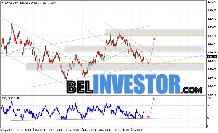 EUR/USD прогноз Евро Доллар на 20 января 2026 предполагает попытку коррекции котировок валюты с тестом уровня поддержки вблизи уровня 1.1605. Откуда стоит ожидать отскок котировок вверх валютной пары Евро Доллар и попытку продолжения роста инструмента на рынке Форекс с целью на уровне 1.1775. Дополнительным сигналом выступит отбой от линии поддержки на индикаторе относительной силы (RSI). Отменой варианта роста пары EUR/USD станет падение котировок и пробой уровня 1.1535. Это укажет на пробой зоны поддержки и продолжение падения валютной пары на Форекс к отметке 1.1445.