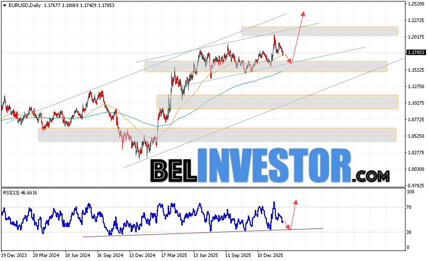 Дополнительным сигналом в пользу подъёма пары EUR/USD на Форекс выступит тест лини поддержки на индикаторе относительной силы (индикатор RSI). Вторым сигналом станет отскок от нижней границы бычьего канала. Отменой варианта роста котировок пары Евро Доллар на текущей торговой неделе 23 — 27 февраля 2026, станет падение и пробой уровня 1.1485. Это укажет на пробой области поддержки и продолжение падения пары в область ниже уровня 1.1135. С пробоем области сопротивления и закрытием котировок выше уровня 1.1785 стоит ожидать подтверждение росту котировок пары, что укажет на возврат цен за ключевое сопротивление по паре.