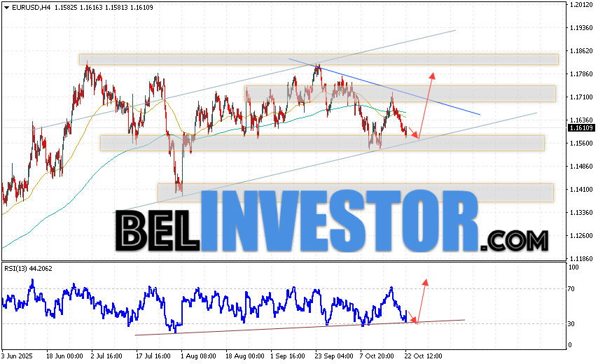 EUR/USD прогноз Евро Доллар на 23 октября 2025 предполагает попытку развития медвежьей коррекции котировок валюты с тестом уровня поддержки вблизи уровня 1.1585. Откуда стоит ожидать отскок котировок вверх валютной пары Евро Доллар и попытку продолжения роста стоимости актива на рынке до отметки 1.1785. Вспомогательным сигналом в пользу подъёма инструмента на рынке Форекс выступит отбой от линии поддержки на индикаторе относительной силы (RSI). Отменой варианта роста пары EUR/USD станет падение котировок и пробой уровня 1.1475. Это укажет на пробой зоны поддержки и продолжение падения валютной пары на Форекс к отметке 1.1365.