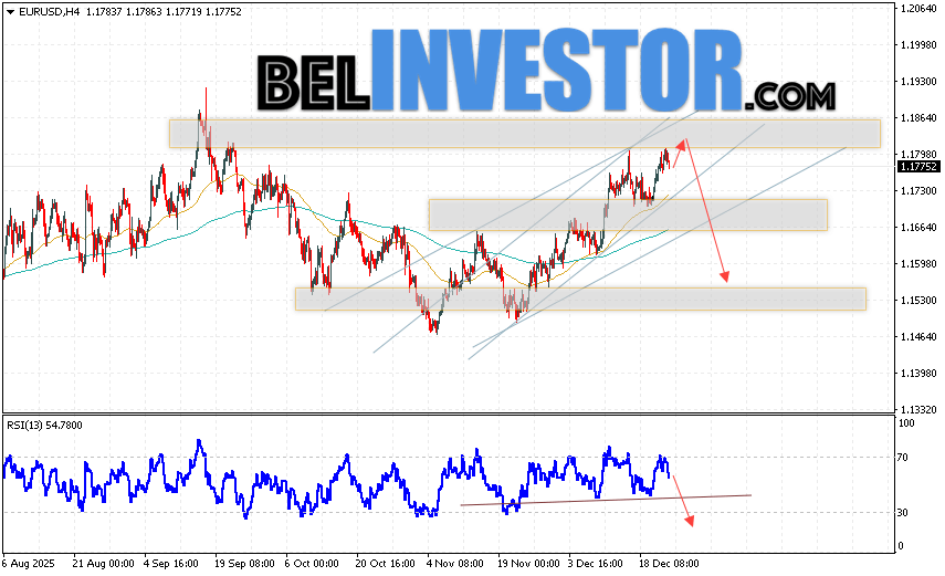 EUR/USD прогноз Евро Доллар на 26 декабря 2025 предполагает попытку бычьего коррекции котировок валюты с тестом уровня сопротивления вблизи уровня 1.1825. Откуда стоит ожидать отскок котировок вниз валютной пары Евро Доллар и попытку продолжения снижения инструмента на рынке Форекс с целью на уровне 1.1565. Дополнительным сигналом выступит отбой от линии сопротивления на индикаторе относительной силы (RSI). Отменой варианта падения пары EUR/USD станет сильный рост котировок и пробой уровня 1.1875. Это укажет на пробой зоны сопротивления и продолжение роста валютной пары на Форекс к отметке 1.1995.