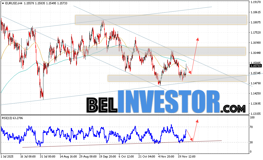 EUR/USD прогноз Евро Доллар на 26 ноября 2025 предполагает попытку развития медвежьей коррекции котировок валюты с тестом уровня поддержки вблизи уровня 1.1530. Откуда стоит ожидать отскок котировок вверх валютной пары Евро Доллар и попытку продолжения роста стоимости актива на рынке до отметки 1.1735. Вспомогательным сигналом в пользу подъёма инструмента на рынке Форекс выступит отбой от линии поддержки на индикаторе относительной силы (RSI). Отменой варианта роста пары EUR/USD станет падение котировок и пробой уровня 1.1435. Это укажет на пробой зоны поддержки и продолжение падения валютной пары на Форекс к отметке 1.1265.