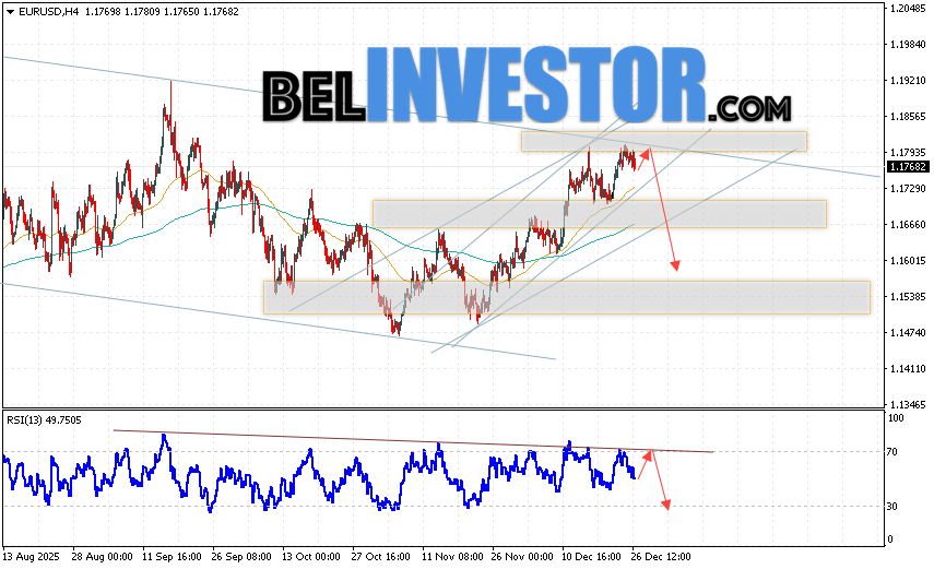 EUR/USD прогноз Евро Доллар на 29 декабря 2025 предполагает попытку бычьего коррекции котировок валюты с тестом уровня сопротивления вблизи уровня 1.1795. Откуда стоит ожидать отскок котировок вниз валютной пары Евро Доллар и попытку продолжения снижения инструмента на рынке Форекс с целью на уровне 1.1605. Дополнительным сигналом выступит отбой от линии сопротивления на индикаторе относительной силы (RSI). Отменой варианта падения пары EUR/USD станет сильный рост котировок и пробой уровня 1.1875. Это укажет на пробой зоны сопротивления и продолжение роста валютной пары на Форекс к отметке 1.1995.