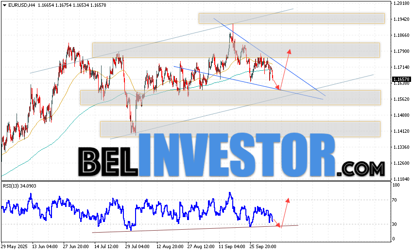 EUR/USD прогноз Евро Доллар на 8 октября 2025 предполагает попытку развития медвежьей коррекции котировок валюты с тестом уровня поддержки вблизи уровня 1.1585. Откуда стоит ожидать отскок котировок вверх валютной пары Евро Доллар и попытку продолжения роста стоимости актива на рынке до отметки 1.1795. Вспомогательным сигналом в пользу подъёма инструмента на рынке Форекс выступит отбой от линии поддержки на индикаторе относительной силы (RSI). Отменой варианта роста пары EUR/USD станет падение котировок и пробой уровня 1.1535. Это укажет на пробой зоны поддержки и продолжение падения валютной пары на Форекс к отметке 1.1325.
