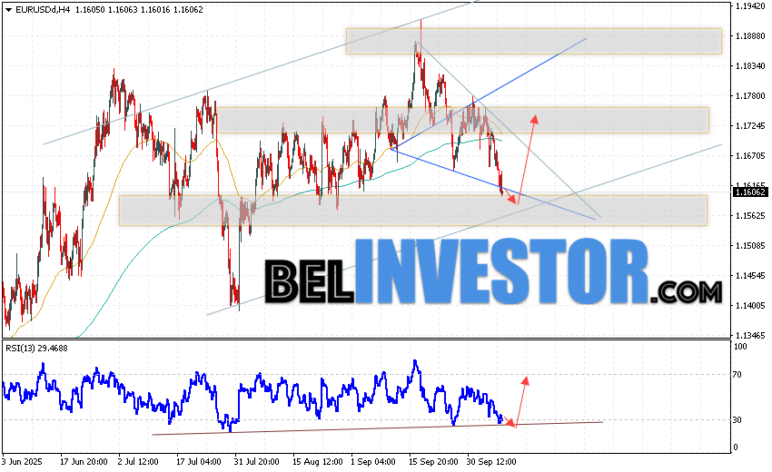 Валютная пара Евро Доллар EUR/USD продолжает движение в рамках развития падения и формирования разворотной модели «Клин». Скользящие средние указывают на наличие краткосрочной бычьей тенденции по паре. Цены пробили область между сигнальными линиями вниз, что указывает на давление со стороны продавцов европейской валюты и потенциальное продолжение падения котировок валютной пары уже с текущих уровней. В момент публикации прогноза курс Евро к Доллару на сегодня составляет 1.160. В рамках Форекс прогноза на 9 октября 2025 стоит ожидать попытку развития снижения и тест уровня поддержки, который располагается на паре EUR/USD вблизи области 1.1575. Далее, отскок цен вверх и начало развития бычьего импульса на валютной паре Евро Доллар. Потенциальной целью такого движения на FOREX выступает область выше уровня 1.1725.