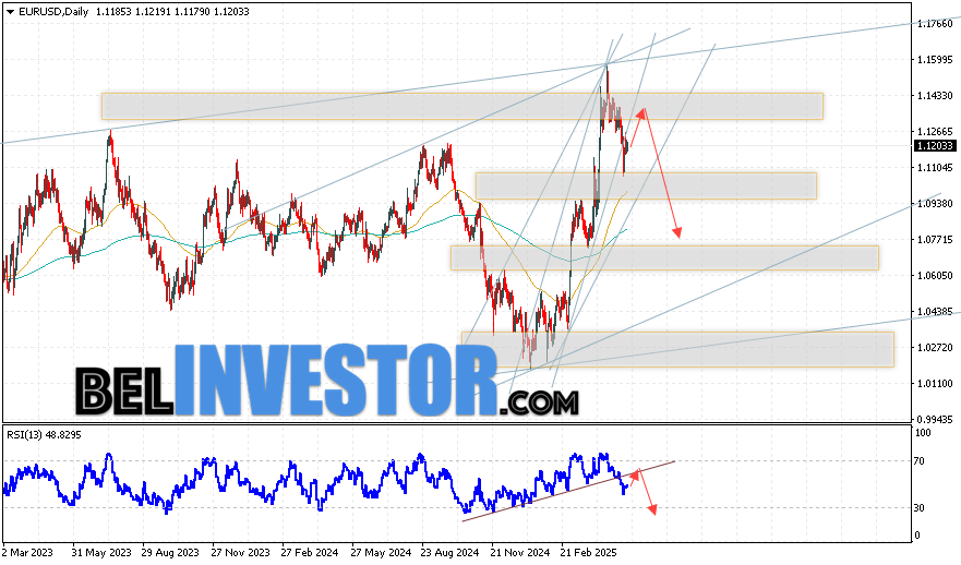 EURUSD прогноз Евро Доллар на 19 — 23 мая 2025 предполагает попытку развития бычьей коррекции и тест области сопротивления вблизи уровня 1.1305. Откуда стоит ожидать отскок цены вниз и продолжения падения пары на рынке Форекс в область ниже уровня 1.0765. Дополнительным сигналом в пользу снижения выступит тест линии сопротивления на индикаторе относительной силы (RSI). Отменой варианта падения Евро Доллар станет сильный рост и пробой уровня 1.1705. В этом случае стоит ожидать продолжения подъёма пары с потенциальной целью на уровне 1.1985.