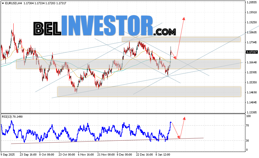 EUR/USD прогноз Евро Доллар на 21 января 2026 предполагает попытку коррекции котировок валюты с тестом уровня поддержки вблизи уровня 1.1675. Откуда стоит ожидать отскок котировок вверх валютной пары Евро Доллар и попытку продолжения роста инструмента на рынке Форекс с целью на уровне 1.1945. Дополнительным сигналом выступит отбой от линии поддержки на индикаторе относительной силы (RSI). Отменой варианта роста пары EUR/USD станет падение котировок и пробой уровня 1.1535. Это укажет на пробой зоны поддержки и продолжение падения валютной пары на Форекс к отметке 1.1425.