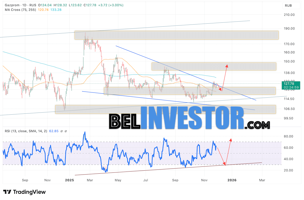 Акции компании Газпром продолжают движение в рамках развития падения и формирования разворотной модели «Клин». На момент публикации прогноза цена акций Газпром составляет 127.78. Скользящие средние сигнализируют о нахождении котировок в медвежьей тенденции. Это открывает перспективы для продолжения снижения акций на торговой неделе. Прогноз Газпром на неделю 1 — 5 декабря 2025 предполагает попытку формирования падения коррекции котировок в акциях Газпром, с тестом уровня поддержки вблизи 123.65. В случае успешного отскока от этой отметки, можно ожидать дальнейший рост котировок с целью выше уровня 145.05.
