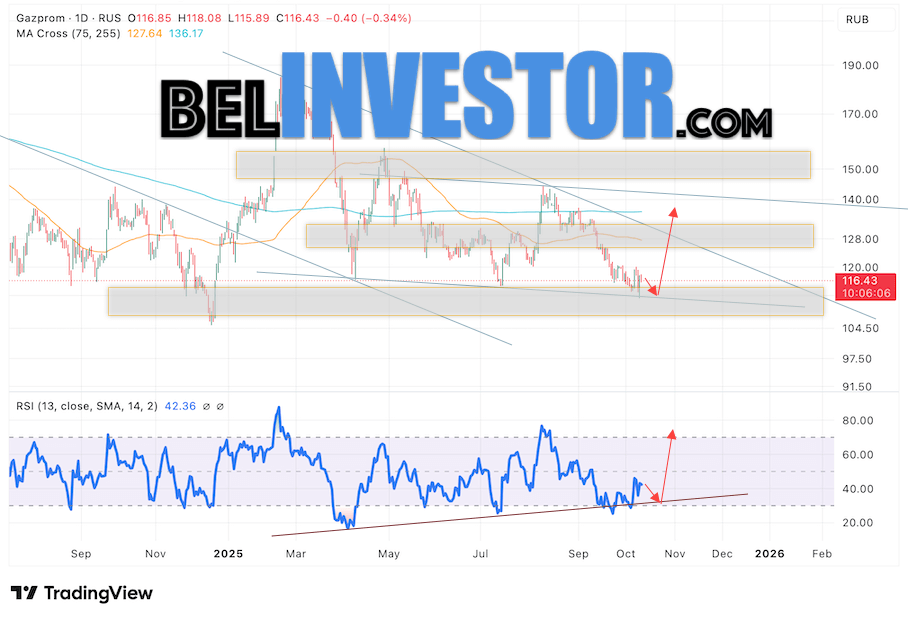 Акции компании Газпром продолжают движение в рамках развития падения и нисходящего канала. На момент публикации прогноза цена акций Газпром составляет 116.43. Скользящие средние сигнализируют о нахождении котировок в медвежьей тенденции. Это открывает перспективы для продолжения снижения акций на торговой неделе. Прогноз Газпром на неделю 13 — 17 октября 2025 предполагает попытку формирования медвежьей коррекции котировок в акциях Газпром, с тестом уровня поддержки вблизи 112.45. В случае успешного отскока от этой отметки, можно ожидать дальнейшее рост котировок с целью выше уровня 130.65.