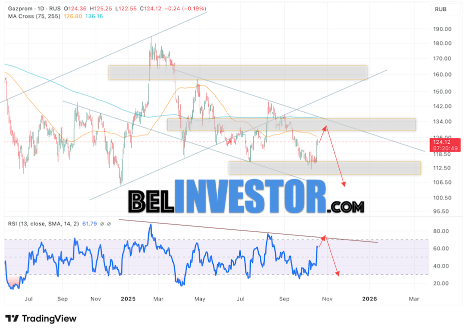 Акции компании Газпром продолжают движение в рамках развития бычьей коррекции и нисходящего канала. На момент публикации прогноза цена акций Газпром составляет 124.12. Скользящие средние сигнализируют о нахождении котировок в медвежьей тенденции. Это открывает перспективы для продолжения снижения акций на торговой неделе. Прогноз Газпром на неделю 20 — 24 октября 2025 предполагает попытку формирования бычьей коррекции котировок в акциях Газпром, с тестом уровня сопротивления вблизи 127.55. В случае успешного отскока от этой отметки, можно ожидать дальнейшее падение котировок с целью ниже уровня 105.05.