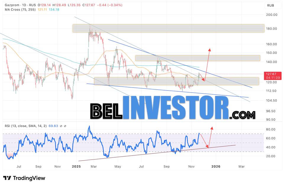 Акции компании Газпром продолжают движение в рамках развития падения и формирования разворотной модели «Клин». На момент публикации прогноза цена акций Газпром составляет 127.67. Скользящие средние сигнализируют о нахождении котировок в медвежьей тенденции. Это открывает перспективы для продолжения снижения акций на торговой неделе. Прогноз Газпром на неделю 24 — 28 ноября 2025 предполагает попытку формирования падения коррекции котировок в акциях Газпром, с тестом уровня поддержки вблизи 120.05. В случае успешного отскока от этой отметки, можно ожидать дальнейший рост котировок с целью выше уровня 155.05.