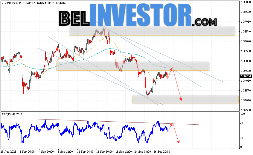 GBP/USD прогноз Фунт Доллар на 1 октября 2025 предполагает попытку развития бычьей коррекции и теста области сопротивления вблизи уровня 1.3465. Затем, продолжение падения котировок с целью вблизи уровня 1.3305. Дополнительным сигналом в пользу снижения Британского Фунта выступит тест линии сопротивления на индикаторе относительной силы (RSI). Отменой варианта падения станет сильный рост Британского Фунта против Доллара США и пробой области 1.3565. Это укажет на продолжение подъёма на Форекс пары с потенциальной целью выше уровня 1.3765.