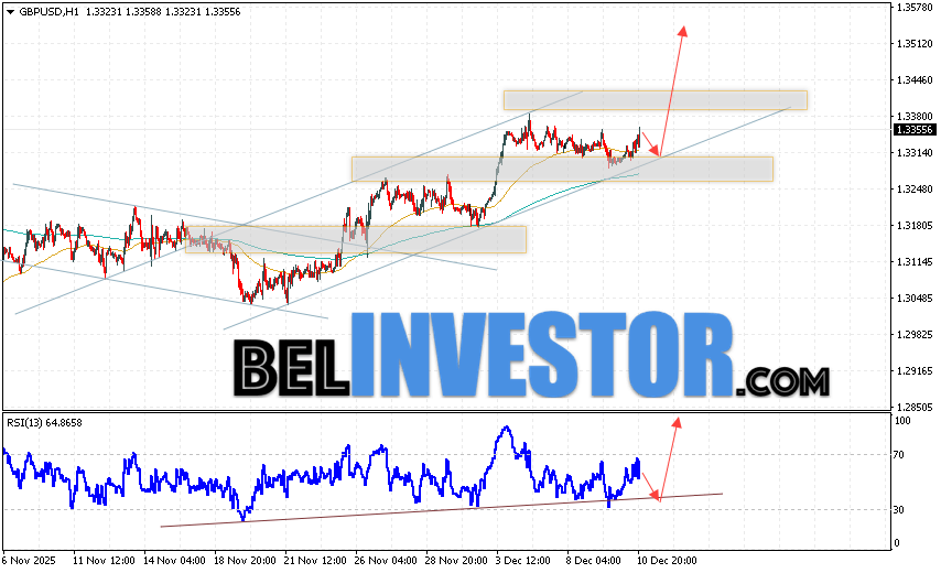 GBP/USD прогноз Фунт Доллар на 11 декабря 2025 предполагает попытку развития медвежьей коррекции и теста области поддержки вблизи уровня 1.3305. Затем, продолжение роста котировок с целью вблизи уровня 1.3545. Дополнительным сигналом в пользу подъёма Британского Фунта выступит тест линии поддержки на индикаторе относительной силы (RSI). Отменой варианта роста станет падение Британского Фунта против Доллара США и пробой области 1.3245. Это укажет на продолжение снижения на Форекс пары с потенциальной целью ниже уровня 1.3005.
