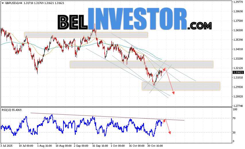 GBP/USD прогноз Фунт Доллар на 13 ноября 2025 предполагает попытку развития бычьей коррекции и теста области сопротивления вблизи уровня 1.3185. Затем, продолжение падения котировок с целью вблизи уровня 1.2885. Дополнительным сигналом в пользу снижения Британского Фунта выступит тест линии сопротивления на индикаторе относительной силы (RSI). Отменой варианта падения станет сильный рост Британского Фунта против Доллара США и пробой области 1.3315. Это укажет на продолжение подъёма на Форекс пары с потенциальной целью выше уровня 1.3475.
