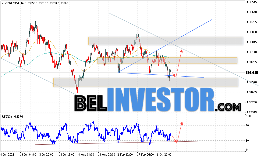 GBP/USD прогноз Фунт Доллар на 14 октября 2025 предполагает попытку развития медвежьей коррекции и теста области поддержки вблизи уровня 1.3245. Затем, продолжение подъёма котировок с целью вблизи уровня 1.3525. Дополнительным сигналом в пользу роста Британского Фунта выступит тест линии поддержки на индикаторе относительной силы (RSI). Отменой варианта роста станет падение Британского Фунта против Доллара США и пробой области 1.3155. Это укажет на продолжение снижения на Форекс пары с потенциальной целью ниже уровня 1.2945.