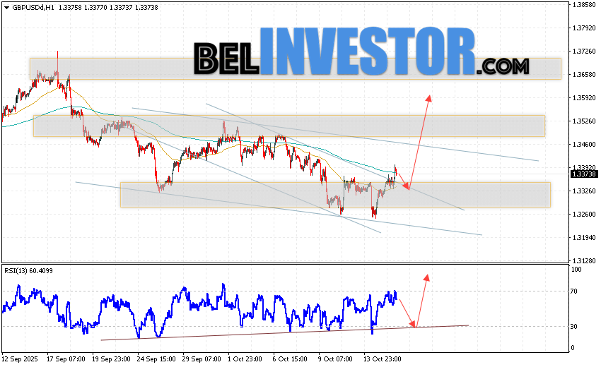 GBP/USD прогноз Фунт Доллар на 16 октября 2025 предполагает попытку развития медвежьей коррекции и теста области поддержки вблизи уровня 1.3335. Затем, продолжение подъёма котировок с целью вблизи уровня 1.3585. Дополнительным сигналом в пользу роста Британского Фунта выступит тест линии поддержки на индикаторе относительной силы (RSI). Отменой варианта роста станет падение Британского Фунта против Доллара США и пробой области 1.3205. Это укажет на продолжение снижения на Форекс пары с потенциальной целью ниже уровня 1.2985.