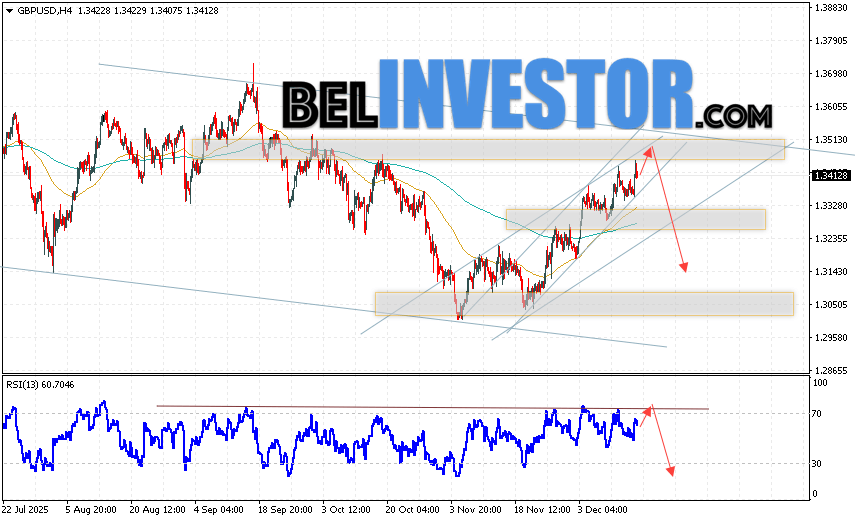 GBP/USD прогноз Фунт Доллар на 17 декабря 2025 предполагает попытку развития бычьей коррекции и теста области сопротивления вблизи уровня 1.3435. Затем, продолжение падения котировок с целью вблизи уровня 1.3145. Дополнительным сигналом в пользу снижения Британского Фунта выступит тест линии сопротивления на индикаторе относительной силы (RSI). Отменой варианта падения станет сильный рост Британского Фунта против Доллара США и пробой области 1.3535. Это укажет на продолжение подъёма на Форекс пары с потенциальной целью выше уровня 1.3765.
