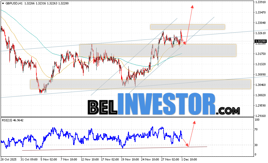GBP/USD прогноз Фунт Доллар на 2 декабря 2025 предполагает попытку развития медвежьей коррекции и теста области поддержки вблизи уровня 1.3215. Затем, продолжение роста котировок с целью вблизи уровня 1.3365. Дополнительным сигналом в пользу подъёма Британского Фунта выступит тест линии поддержки на индикаторе относительной силы (RSI). Отменой варианта роста станет падение Британского Фунта против Доллара США и пробой области 1.3175. Это укажет на продолжение снижения на Форекс пары с потенциальной целью ниже уровня 1.2965.