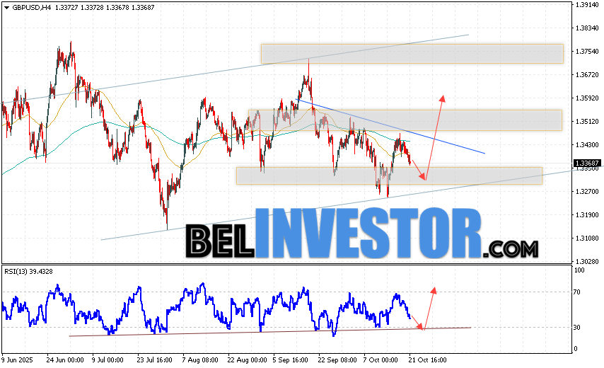 GBP/USD прогноз Фунт Доллар на 22 октября 2025 предполагает попытку развития медвежьей коррекции и теста области поддержки вблизи уровня 1.3315. Затем, продолжение подъёма котировок с целью вблизи уровня 1.3605. Дополнительным сигналом в пользу роста Британского Фунта выступит тест линии поддержки на индикаторе относительной силы (RSI). Отменой варианта роста станет падение Британского Фунта против Доллара США и пробой области 1.3195. Это укажет на продолжение снижения на Форекс пары с потенциальной целью ниже уровня 1.3005.