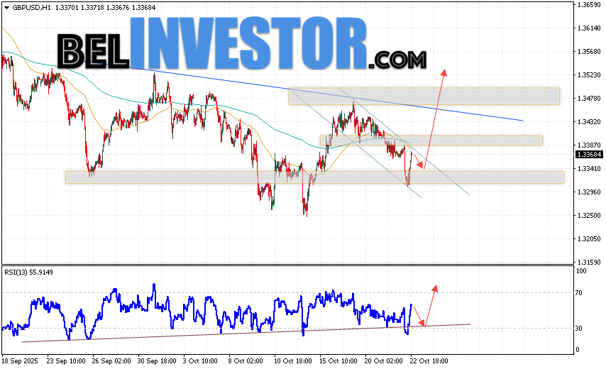 GBP/USD прогноз Фунт Доллар на 23 октября 2025 предполагает попытку развития медвежьей коррекции и теста области поддержки вблизи уровня 1.3335. Затем, продолжение подъёма котировок с целью вблизи уровня 1.3525. Дополнительным сигналом в пользу роста Британского Фунта выступит тест линии поддержки на индикаторе относительной силы (RSI). Отменой варианта роста станет падение Британского Фунта против Доллара США и пробой области 1.3205. Это укажет на продолжение снижения на Форекс пары с потенциальной целью ниже уровня 1.3025.