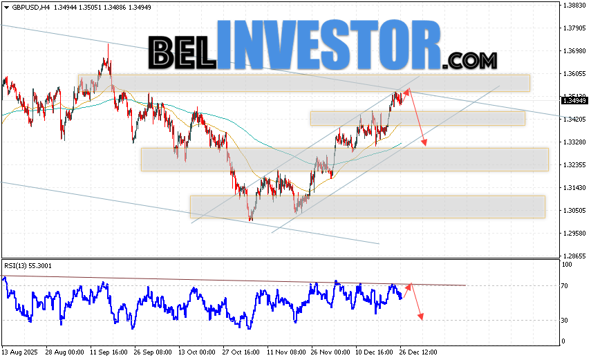 GBP/USD прогноз Фунт Доллар на 29 декабря 2025 предполагает попытку развития бычьей коррекции и теста области поддержки вблизи уровня 1.3515. Затем, продолжение падения котировок с целью вблизи уровня 1.3315. Дополнительным сигналом в пользу снижения Британского Фунта выступит тест линии сопротивления на индикаторе относительной силы (RSI). Отменой варианта падения станет сильный рост Британского Фунта против Доллара США и пробой области 1.3645. Это укажет на продолжение подъёма на Форекс пары с потенциальной целью выше уровня 1.3865.