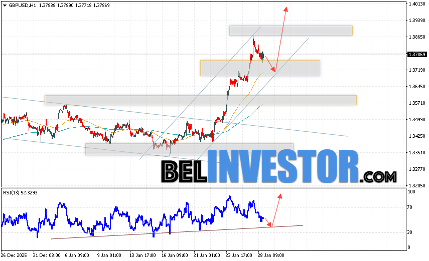 GBP/USD прогноз Фунт Доллар на 29 января 2026 предполагает попытку развития падения и теста области поддержки вблизи уровня 1.3715. Затем, продолжение роста котировок с целью вблизи уровня 1.3965. Дополнительным сигналом в пользу подъёма Британского Фунта выступит тест линии поддержки на индикаторе относительной силы (RSI). Отменой варианта роста станет падение Британского Фунта против Доллара США и пробой области 1.3665. Это укажет на продолжение снижения на Форекс пары с потенциальной целью ниже уровня 1.3485.