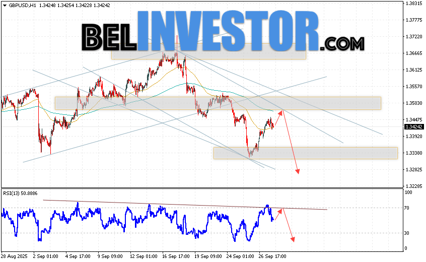 GBP/USD прогноз Фунт Доллар на 30 сентября 2025 предполагает попытку развития бычьей коррекции и теста области сопротивления вблизи уровня 1.3475. Затем, продолжение падения котировок с целью вблизи уровня 1.3265. Дополнительным сигналом в пользу снижения Британского Фунта выступит тест линии сопротивления на индикаторе относительной силы (RSI). Отменой варианта падения станет сильный рост Британского Фунта против Доллара США и пробой области 1.3565. Это укажет на продолжение подъёма на Форекс пары с потенциальной целью выше уровня 1.3765.