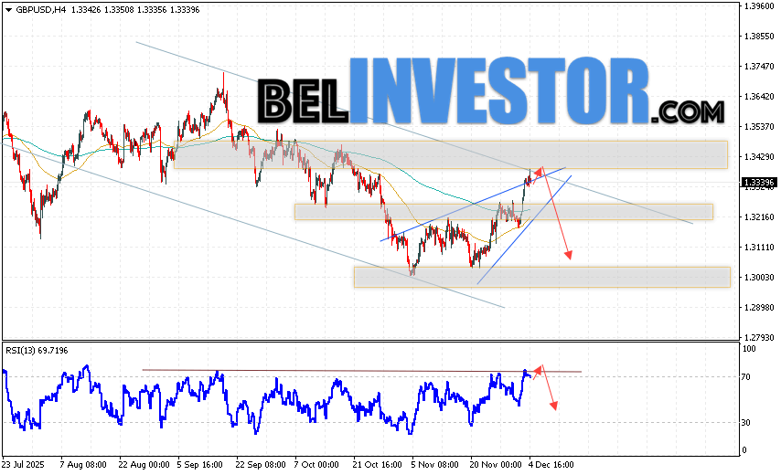 GBP/USD прогноз Фунт Доллар на 5 декабря 2025 предполагает попытку развития бычьей коррекции и теста области сопротивления вблизи уровня 1.3255. Затем, продолжение падения котировок с целью вблизи уровня 1.3085. Дополнительным сигналом в пользу снижения Британского Фунта выступит тест линии сопротивления на индикаторе относительной силы (RSI). Отменой варианта падения станет сильный рост Британского Фунта против Доллара США и пробой области 1.3445. Это укажет на продолжение подъёма на Форекс пары с потенциальной целью выше уровня 1.3665.