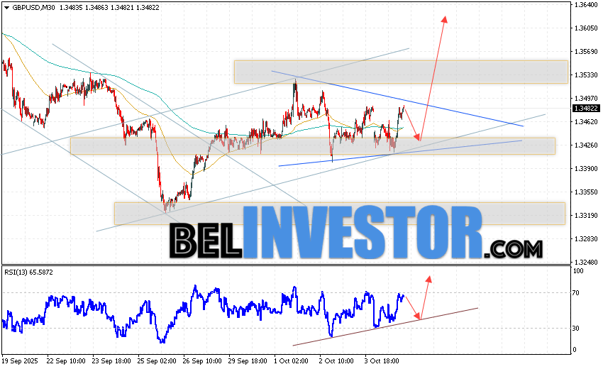 GBP/USD прогноз Фунт Доллар на 7 октября 2025 предполагает попытку развития медвежьей коррекции и теста области поддержки вблизи уровня 1.3435. Затем, продолжение роста котировок с целью вблизи уровня 1.3615. Дополнительным сигналом в пользу подъёма Британского Фунта выступит тест линии поддержки на индикаторе относительной силы (RSI). Отменой варианта роста станет падение Британского Фунта против Доллара США и пробой области 1.3375. Это укажет на продолжение снижения на Форекс пары с потенциальной целью ниже уровня 1.3185.