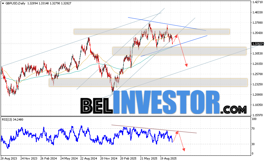 GBPUSD прогноз Фунта на неделю 13 — 17 октября 2025 предполагает попытку развития бычьей коррекции и теста уровня сопротивления вблизи области 1.3485. Откуда стоит ожидать продолжения падения валютной пары с целью ниже области 1.2775. Дополнительным сигналом в пользу снижения выступит тест линии тренда на индикаторе относительной силы. Отменой варианта падения пары Фунт Доллар станет сильный рост и пробой уровня 1.3865. В этом случае стоит ожидать продолжения подъёма пары с потенциальной целью выше уровня 1.4205.