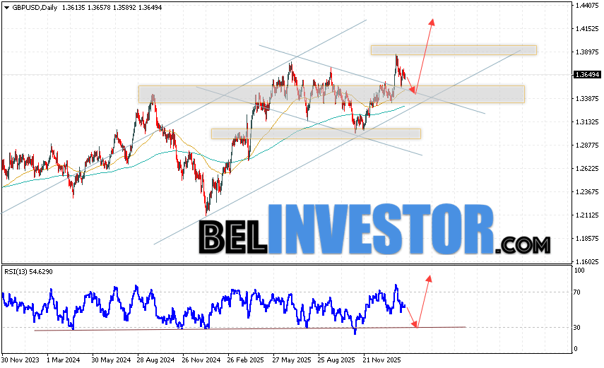 GBPUSD прогноз Фунта на неделю 16 — 20 февраля 2026 предполагает попытку развития медвежьей коррекции и теста уровня поддержки вблизи области 1.3425. Откуда стоит ожидать продолжения роста валютной пары с целью выше области 1.4175. Дополнительным сигналом в пользу подъёма выступит тест линии тренда на индикаторе относительной силы. Отменой варианта роста пары Фунт Доллар станет падение и пробой уровня 1.3155. В этом случае стоит ожидать продолжения падения пары с потенциальной целью ниже уровня 1.2765.