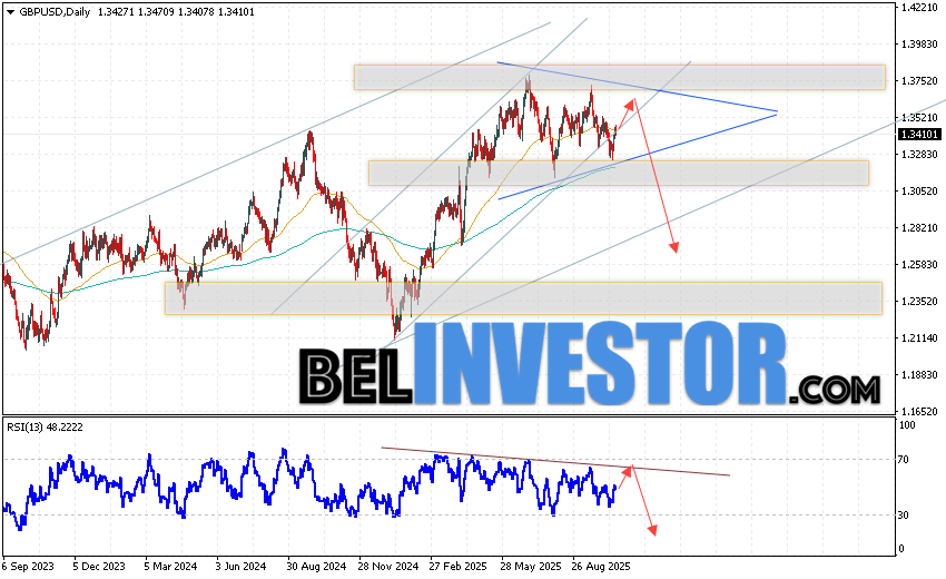 GBPUSD прогноз Фунта на неделю 20 — 24 октября 2025 предполагает попытку развития бычьей коррекции и теста уровня сопротивления вблизи области 1.3535. Откуда стоит ожидать продолжения падения валютной пары с целью ниже области 1.2645. Дополнительным сигналом в пользу снижения выступит тест линии тренда на индикаторе относительной силы. Отменой варианта падения пары Фунт Доллар станет сильный рост и пробой уровня 1.3865. В этом случае стоит ожидать продолжения подъёма пары с потенциальной целью выше уровня 1.4175.