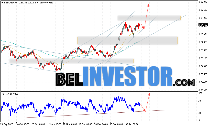NZD/USD прогноз Форекс и аналитика на 13 февраля 2026 предполагает попытку теста области поддержки вблизи уровня 0.6045. Откуда стоит ожидать продолжения роста котировок в область выше уровня 0.6245. Дополнительным сигналом в пользу подъёма выступит отбой от линии поддержки на индикаторе относительной силы. Отменой варианта роста пары NZD/USD станет падение цены и пробой уровня 0.5955. В этом случае стоит ожидать продолжение снижения пары с потенциальной целью ниже уровня 0.5825.