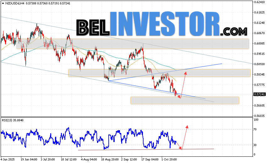 NZD/USD прогноз Форекс и аналитика на 14 октября 2025 предполагает попытку теста области поддержки вблизи уровня 0.5705. Откуда стоит ожидать продолжения роста котировок в область выше уровня 0.5835. Дополнительным сигналом в пользу подъёма выступит отбой от линии поддержки на индикаторе относительной силы. Отменой варианта роста пары NZD/USD станет падение цены и пробой уровня 0.5665. В этом случае стоит ожидать продолжение снижения пары с потенциальной целью ниже уровня 0.5475.