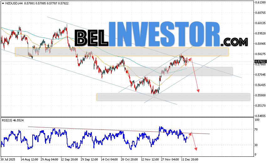 NZD/USD прогноз Форекс и аналитика на 17 декабря 2025 предполагает попытку теста области сопротивления вблизи уровня 0.5795. Откуда стоит ожидать продолжения падения котировок в область ниже уровня 0.5585. Дополнительным сигналом в пользу падения выступит отбой от линии сопротивления на индикаторе относительной силы. Отменой варианта снижения пары NZD/USD станет сильный рост цены и пробой уровня 0.5875. В этом случае стоит ожидать продолжение роста пары с потенциальной целью выше уровня 0.6115.