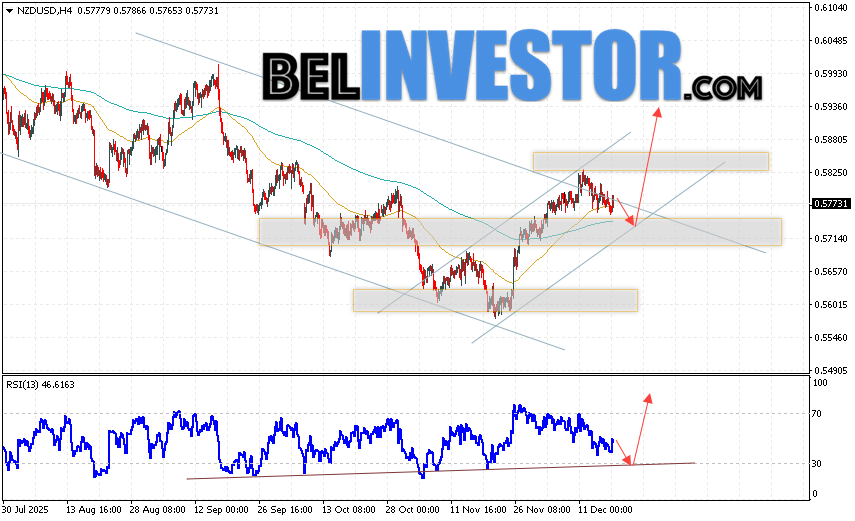 NZD/USD прогноз Форекс и аналитика на 19 декабря 2025 предполагает попытку теста области поддержки вблизи уровня 0.5735. Откуда стоит ожидать продолжения роста котировок в область выше уровня 0.5935. Дополнительным сигналом в пользу подъёма выступит отбой от линии поддержки на индикаторе относительной силы. Отменой варианта роста пары NZD/USD станет падение цены и пробой уровня 0.5665. В этом случае стоит ожидать продолжение снижения пары с потенциальной целью ниже уровня 0.5475.