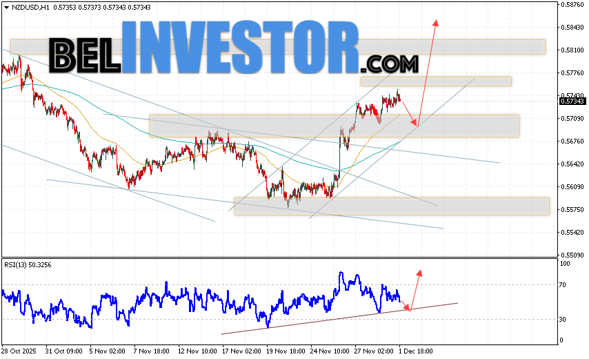 NZD/USD прогноз Форекс и аналитика на 2 декабря 2025 предполагает попытку теста области поддержки вблизи уровня 0.5695. Откуда стоит ожидать продолжения роста котировок в область выше уровня 0.5845. Дополнительным сигналом в пользу подъёма выступит отбой от линии поддержки на индикаторе относительной силы. Отменой варианта роста пары NZD/USD станет падение цены и пробой уровня 0.5645. В этом случае стоит ожидать продолжение падения пары с потенциальной целью ниже уровня 0.5375.