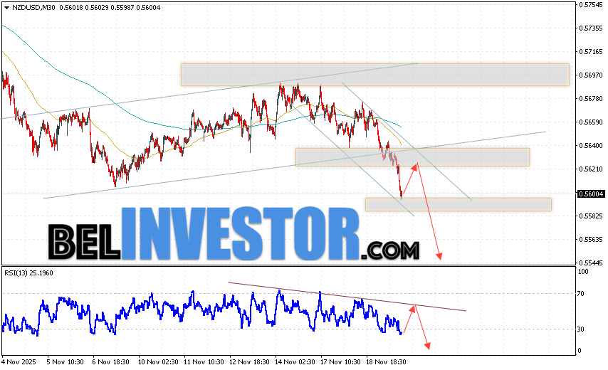 NZD/USD прогноз Форекс и аналитика на 20 ноября 2025 предполагает попытку теста области сопротивления вблизи уровня 0.5625. Откуда стоит ожидать продолжения падения котировок в область ниже уровня 0.5655. Дополнительным сигналом в пользу снижения выступит отбой от линии сопротивления на индикаторе относительной силы. Отменой варианта падения пары NZD/USD станет сильный рост цены и пробой уровня 0.5685. В этом случае стоит ожидать продолжение роста пары с потенциальной целью выше уровня 0.5875.