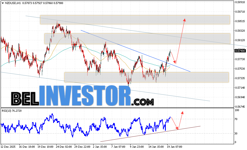NZD/USD прогноз Форекс и аналитика на 20 января 2026 предполагает попытку теста области поддержки вблизи уровня 0.5755. Откуда стоит ожидать продолжения роста котировок в область выше уровня 0.5865. Дополнительным сигналом в пользу подъёма выступит отбой от линии поддержки на индикаторе относительной силы. Отменой варианта роста пары NZD/USD станет падение цены и пробой уровня 0.5705. В этом случае стоит ожидать продолжение снижения пары с потенциальной целью ниже уровня 0.5535.
