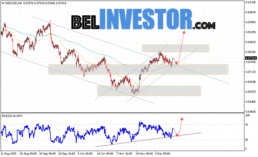 NZD/USD прогноз Форекс и аналитика на 23 декабря 2025 предполагает попытку теста области поддержки вблизи уровня 0.5745. Откуда стоит ожидать продолжения роста котировок в область выше уровня 0.5935. Дополнительным сигналом в пользу подъёма выступит отбой от линии поддержки на индикаторе относительной силы. Отменой варианта роста пары NZD/USD станет падение цены и пробой уровня 0.5695. В этом случае стоит ожидать продолжение снижения пары с потенциальной целью ниже уровня 0.5475.